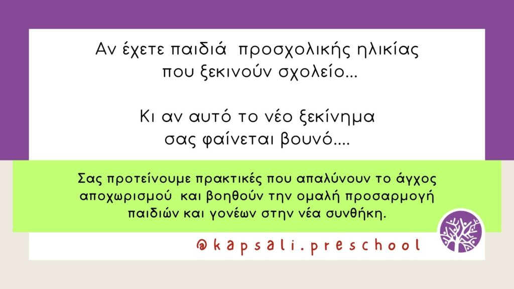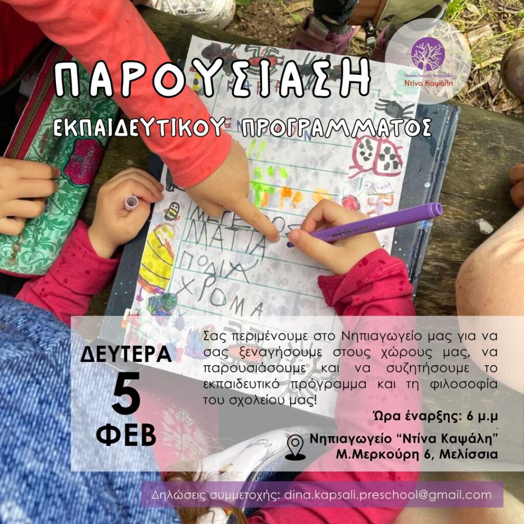 Έχετε παιδιά προσχολικής ηλικίας και αναρωτιέστε πώς γίνεται… ⭕ Να αγαπήσουν το σχολείο; ⭕ Να αγαπήσουν και να εμπιστευτούν τον εαυτό τους; ⭕ Να μάθουν τον τρόπο να μαθαίνουν, να σχετίζονται, να διεκδικούν και να υπερασπίζονται τα δικαιώματά τους; Ελάτε να το ανακαλύψετε! Σας περιμένουμε την Δευτέρα 5 Φεβρουαρίου στις 6 το απόγευμα στο Νηπιαγωγείο …