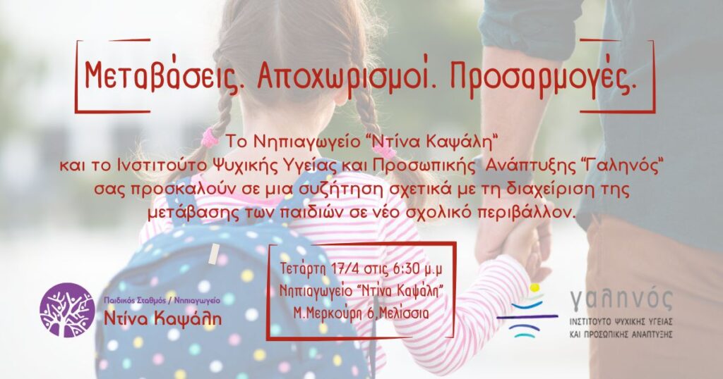 Την Τετάρτη 17/4 στο πλαίσιο της συνεργασίας μας με το Ινστιτούτο Ψυχικής Υγείας και Προσωπικής Ανάπτυξης Γαληνός, θα έχουμε την ευκαιρία να συζητήσουμε με την ψυχολόγο του σχολείου Βέρα Σαββάκη, τους γονείς και την παιδαγωγική ομάδα για τις μεταβάσεις, τους αποχωρισμούς και την προσαρμογή σε κάθε νέο σχολικό περιβάλλον. Από το σπίτι στον Παιδικό Σταθμό, …